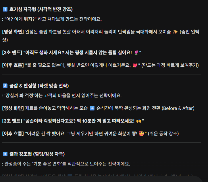 - 위의 [훅 추출 프롬프트]를 입력해서 오프닝 멘트 3개를 받는다.